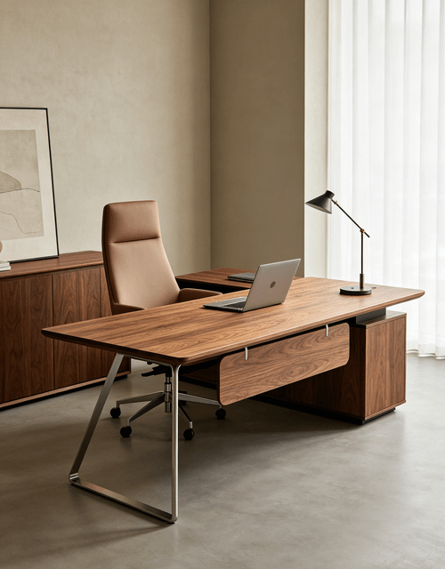北歐風格單人胡桃木主管辦公枱(實木桌面+金屬支架)